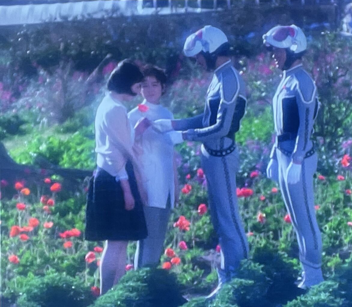 右から花畑に立つ ダン隊員役の森次浩司さん アマギ隊員役の古谷敏さん