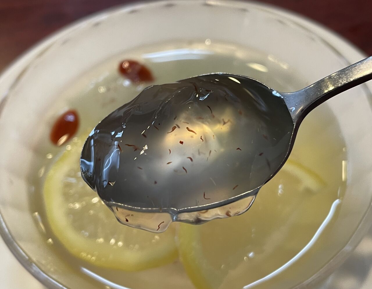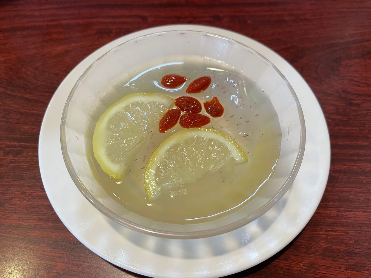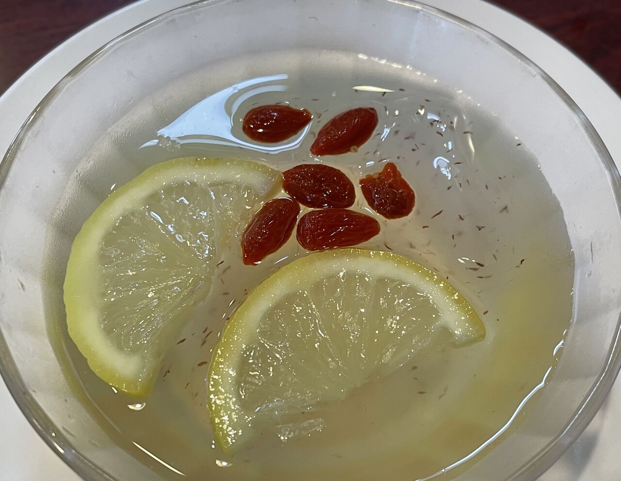 メニュー通りのレモンスライス2切れとクコの実が6粒添えられています