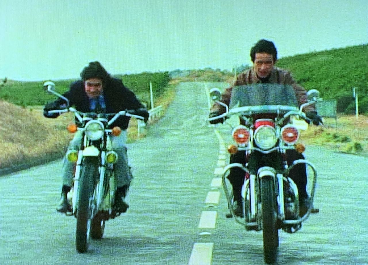さそり男との戦いが終わり バイクの後ろにルリ子を乗せ