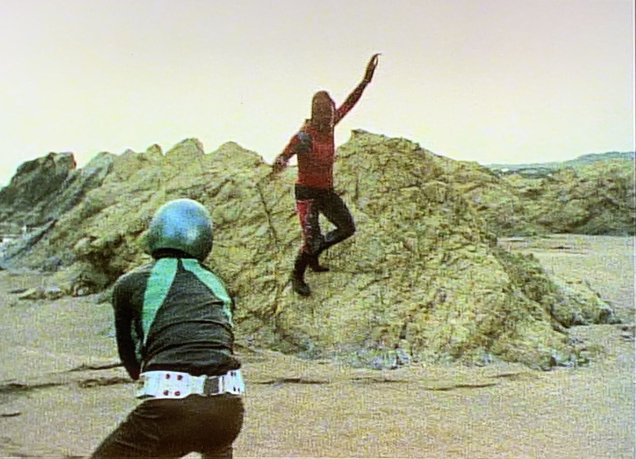 平砂浦の砂丘でショッカーと戦う仮面ライダー